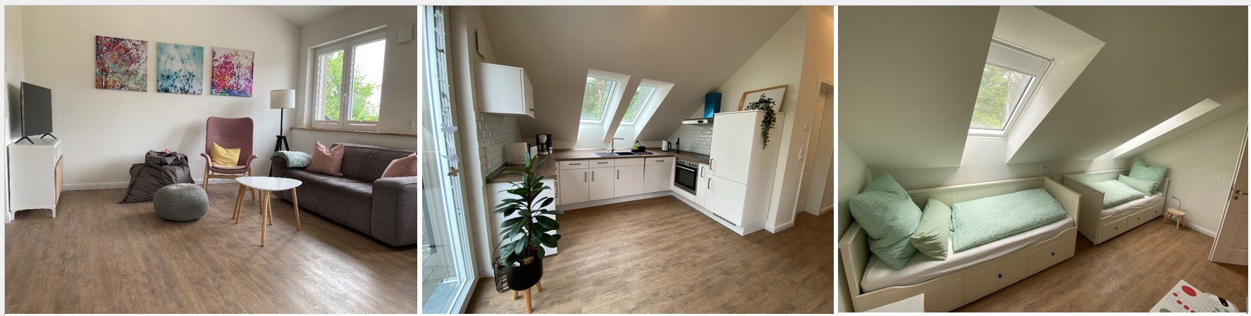 Die 2021 neu gebaute 5-Sterne* Ferienwohnung mit 102qm liegt im Obergeschoss. Der Wohn-, Ess- und Kochbereich ist mit seinen bis zu 4m hohen Decken sehr hell und großzügig. Die Wohnung bietet Ihnen 2 separate Schlafzimmer, mit einem großem Kingsize-Boxspringbett und 2 gemütlichen Einzelbetten. Auf der 21qm großen Süd-West-Dachterrasse mit umgebendem Gründach können Sie die Sonne beim Entspannen und Grillen genießen. Im eigenem Fahrradschuppen können Sie Ihre Fahrräder und e-Bikes sicher verschließen.